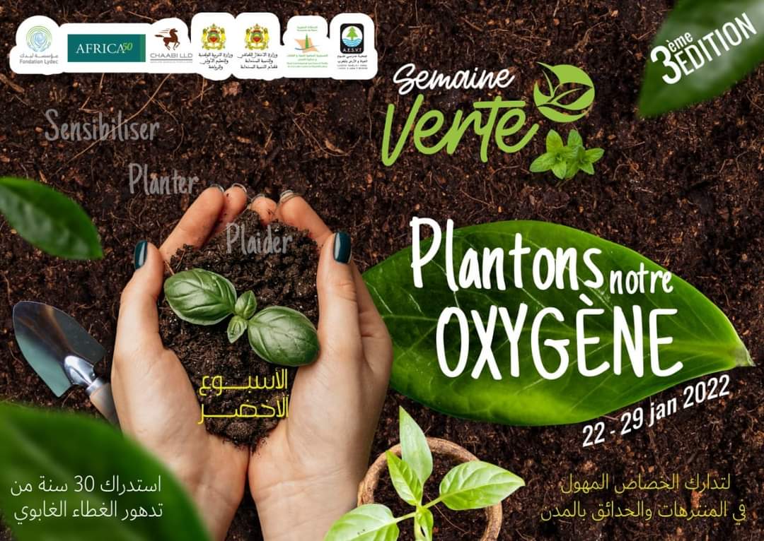 في هذا الإطار، تنظم جمعية مدرسي علوم الأرض والحياة بالمغرب وشركائها (وزارة التربية الوطنية والشباب، قطاع الجهوية للمياه والغابات، مؤسسة ليدي، البنك الشعبي، أفريقيا 50، الائتلاف المغربي من أجل المناخ والتنمية المستدامة.)، من 22 إلى 29 يناير، الأسبوع الأخضر 2022. لقاء وطني ولقاءات جهوية، تهدف إلى فتح حوار مع الخبراء والمسؤولين والفاعلين، حول واقع وآفاق غاباتنا ومساحاتنا الخضراء. كما سيكون فرصة لإطلاق حملة غرس كبيرة في أكثر من 25 مدينة في جميع أنحاء المملكة من قبل الجهات الفاعلة والمدارس والشركات.