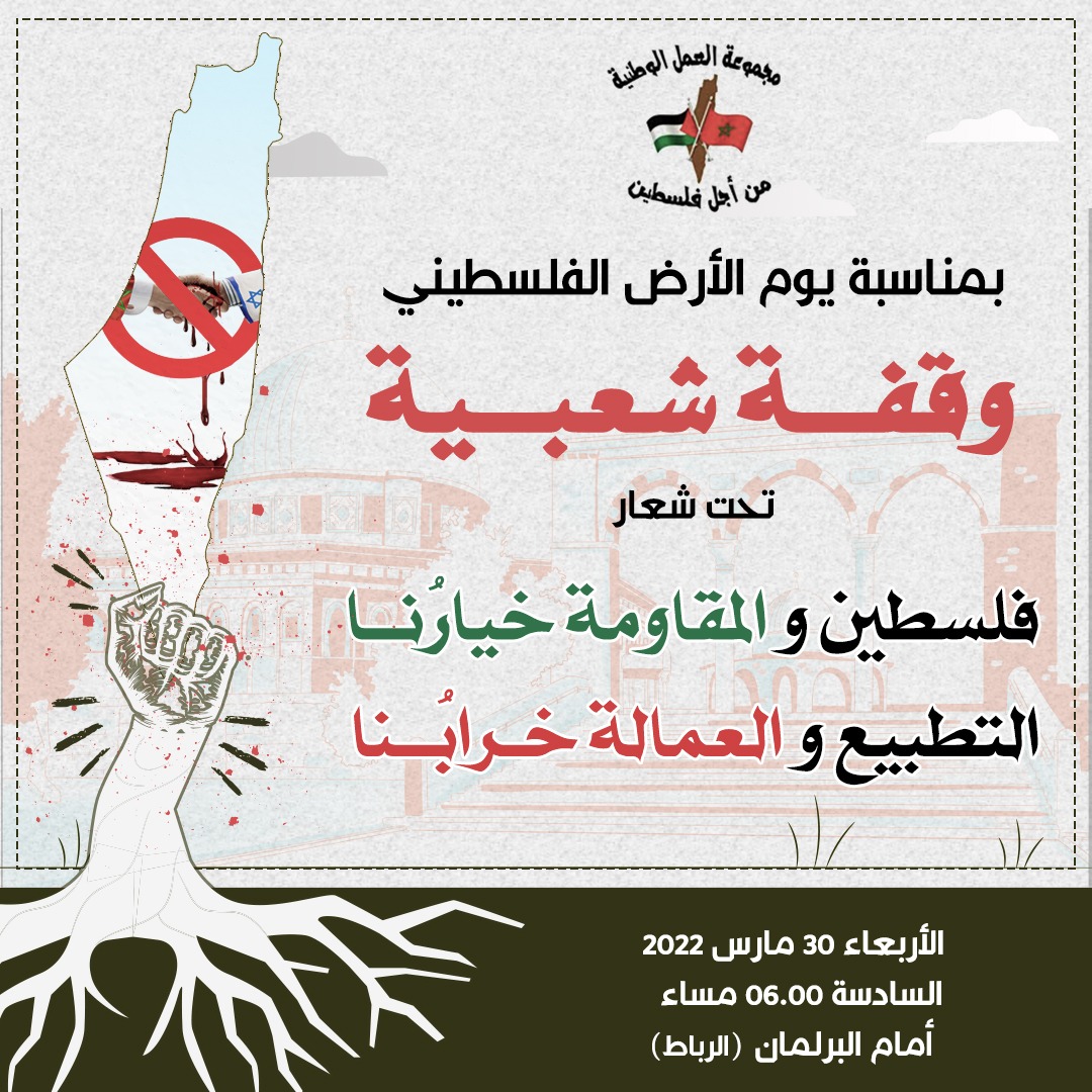 بمناسبة يوم الأرض الفلسطيني ؛ و في إطار برنامج فعالياتها الداعمة للقضية الفلسطينية و الرافضة لكل أشكال و مظاهر التطبيع الخيانية؛ تنظم مجموعة العمل الوطنية من أجل فلسطين وقفة شعبية تحت شعار: