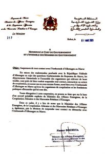 وفيما لم تعلن عن السبب الرئيسي، فإن الخارجية وجهت مراسلة رسمية لرئيس الحكومة وكافة القطاعات الحكومية حول قرار تجميد التواصل مع السفارة الألمانية بالرباط.