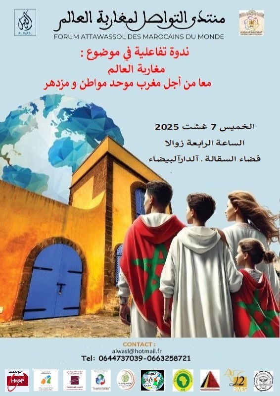 معًا من أجل مغرب موحد، مواطن ومزدهر في إطار الاحتفال باليوم الوطني للمهاجر، سيتم تنظيم ندوة يوم الخميس 7 غشت على الساعة الرابعة زوالا بفضاء السقالة شارع الموحدين، الدار البيضاء ويُعقد هذا اللقاء تحت شعار: “معًا من أجل مغرب موحد، مواطن ومزدهى”، بهدف تبادل الآراء والنقاش حول تحديات وتطلعات المغاربة المقيمين بالخارج، مع إبراز التزامهم من أجل مغرب منفتح، شامل ومتطلع إلى المستقبل.مغرب موحد في تنوعه الجهوي، وتعدد خصوصياته الثقافية، و بمواطنيه المقيمين بالخارج الذين يشكلون أكثر من 15% من السكان، موزعين على أكثر من 100 دولة، ومعظمهم من الشباب، ذوي مستوى تعليمي عالٍ ومواهب متعددة التخصصاتمغرب مواطن، يعترف لمغاربة العالم بحق المواطنة الكاملة، من خلال مشاركتهم في الحياة العامة، وانطلاقا إعتماد آليات تشجع المشاركة السياسية والديمقراطية التشاركية.مغرب مزدهر، بسياسات عمومية تشجع انخراط مغاربة العالم في التنمية الاقتصادية والاجتماعية، وتساهم في تقليص الفوارق الجهوية وتحسين ظروف عيش السكان ويأتي هذا اللقاء في اطار لقاءأت السنوات السابقة لمنتدى التواصل لمغاربة العالم، و التى تطرقت في دورة 2023 إلى موضوع “مغاربة العالم والتعاقد الاجتماعي الجديد” و في دورة 2024 إلى موضوع “مغرب التطلعات2030” ٠ وسيجمع هذا الحدث مسؤولين مؤسساتيين، ممثلين عن المجتمع المدني، باحثين، وفعاليات من مغاربة العالم، لمناقشة عدد من المواضيع الأساسية، من بينها: حقوق وواجبات مغاربة العالتعبئة الكفاءات والجهات من أجل التنمية المحليةالهوية، الثقافة، الانتماء المزدوج والمواطنة العابرة للاوطاندور مغاربة العالم في إشعاع المغرب دوليًا
