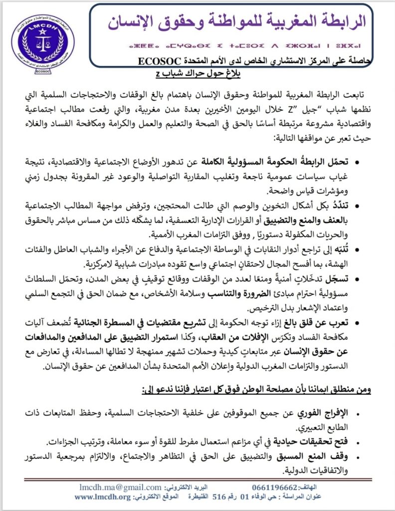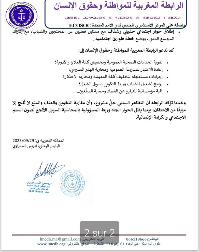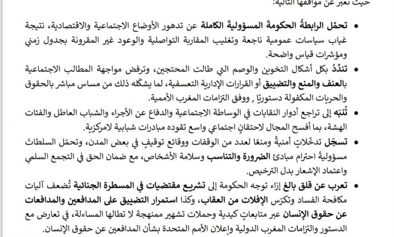 تابعت الرابطة المغربية للمواطنة وحقوق الإنسان باهتمام بالغ الوقفات والاحتجاجات السلمية التي نظمها شباب “جيل Z” خلال اليومين الأخيرين بعدة مدن مغربية، والتي رفعت مطالب اجتماعية واقتصادية مشروعة مرتبطة أساسًا بالحق في الصحة والتعليم والعمل والكرامة ومكافحة الفساد والغلاء حيث تعبر عن مواقفها التالية:• تحمِّل الرابطةُ الحكومةَ المسؤوليةَ الكاملة عن تدهور الأوضاع الاجتماعية والاقتصادية، نتيجة غياب سياسات عمومية ناجعة وتغليب المقاربة التواصلية والوعود غير المقرونة بجدول زمني ومؤشرات قياس واضحة.• تندِّدُ بكل أشكال التخوين والوصم التي طالت المحتجين، وترفض مواجهة المطالب الاجتماعية بـالعنف والمنع والتضييق أو القرارات الإدارية التعسفية، لما يشكّله ذلك من مساس مباشر بالحقوق والحريات المكفولة دستوريًا , ووفق التزامات المغرب الأممية.• تُنبّه إلى تراجع أدوار النقابات في الوساطة الاجتماعية والدفاع عن الأجراء والشباب العاطل والفئات الهشة، بما أفسح المجال لاحتقانٍ اجتماعي واسع تقوده مبادرات شبابية لامركزية.• تسجّل تدخّلاتٍ أمنيةً ومنعًا لعدد من الوقفات ووقائع توقيفٍ في بعض المدن، وتحمّل السلطاتَ مسؤوليةَ احترام مبادئ الضرورة والتناسب وسلامة الأشخاص، مع ضمان الحق في التجمع السلمي واعتماد الإشعار بدل الترخيص.• تعرب عن قلق بالغ إزاء توجه الحكومة إلى تشريع مقتضيات في المسطرة الجنائية تُضعف آليات مكافحة الفساد وتكرّس الإفلات من العقاب، وكذا استمرار التضييق على المدافعين والمدافعات عن حقوق الإنسان عبر متابعاتٍ كيدية وحملات تشهير ممنهجة لا تطالها المساءلة، في تعارض مع الدستور والتزامات المغرب الدولية وإعلان الأمم المتحدة بشأن المدافعين عن حقوق الإنسان.ومن منطلق ابماننا بأن مصلحة الوطن فوق كل اعتبار فإننا ندعو إلى:• الإفراج الفوري عن جميع الموقوفين على خلفية الاحتجاجات السلمية، وحفظ المتابعات ذات الطابع التعبيري.• فتح تحقيقات حيادية في أي مزاعم استعمال مفرط للقوة أو سوء معاملة، وترتيب الجزاءات.• وقف المنع المسبق والتضييق على الحق في التظاهر والاجتماع، والالتزام بمرجعية الدستور والاتفاقيات الدولية.• إطلاق حوار اجتماعي حقيقي وشفاف مع ممثلين فعليين عن المحتجين والشباب، مع إشراك المجتمع المدني، ووضع خطة طوارئ اجتماعية .كما تدعو الرابطة المغربية للمواطنة وحقوق الإنسان إلى:• تقوية الخدمات الصحية العمومية وتخفيض كلفة العلاج والأدوية؛• إعادة الاعتبار للمدرسة العمومية ومحاربة الهدر المدرسي؛• إجراءات مستعجلة لتخفيف كلفة المعيشة ومحاربة الاحتكار؛• برامج تشغيل للشباب وربط التكوين بسوق الشغل؛• آلية مؤسساتية للتبليغ عن الفساد وحماية المبلّغين..وختاما تؤكد الرابطة أن التظاهر السلمي حقٌّ مشروع، وأن مقاربة التخوين والعنف والمنع لا تُنتج إلا مزيدًا من الاحتقان، بينما يظل الحوار الجاد وربط المسؤولية بالمحاسبة السبيل الأنجع لصون السلم الاجتماعي والكرامة الإنسانية.