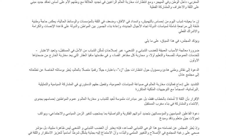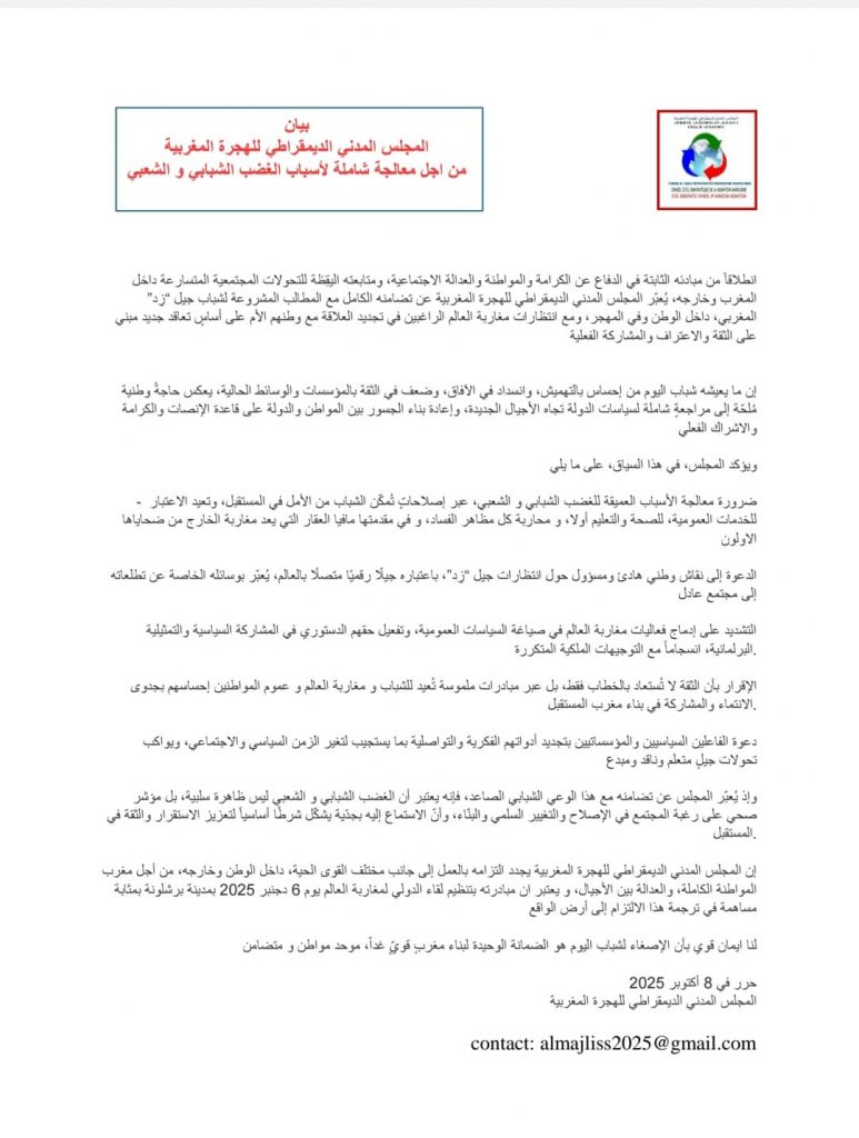 انطلاقاً من مبادئه الثابتة في الدفاع عن الكرامة والمواطنة والعدالة الاجتماعية، ومتابعته اليقِظة للتحولات المجتمعية المتسارعة داخل المغرب وخارجه، يُعبّر المجلس المدني الديمقراطي للهجرة المغربية عن تضامنه الكامل مع المطالب المشروعة لشباب جيل “زِد” المغربي، داخل الوطن وفي المهجر، ومع انتظارات مغاربة العالم الراغبين في تجديد العلاقة مع وطنهم الأم على أساسٍ تعاقد جديد مبني على الثقة والاعتراف والمشاركة الفعليةإن ما يعيشه شباب اليوم من إحساس بالتهميش، وانسداد في الآفاق، وضعف في الثقة بالمؤسسات والوسائط الحالية، يعكس حاجةً وطنية مُلحّة إلى مراجعةٍ شاملة لسياسات الدولة تجاه الأجيال الجديدة، وإعادة بناء الجسور بين المواطن والدولة على قاعدة الإنصات والكرامة والاشراك الفعليويؤكد المجلس، في هذا السياق، على ما يلي- ضرورة معالجة الأسباب العميقة للغضب الشبابي و الشعبي، عبر إصلاحاتٍ تُمكّن الشباب من الأمل في المستقبل، وتعيد الاعتبار للخدمات العمومية، للصحة والتعليم أولا، و محاربة كل مظاهر الفساد، و في مقدمتها مافيا العقار التي يعد مغاربة الخارج من ضحاياها الاولون- الدعوة إلى نقاش وطني هادئ ومسؤول حول انتظارات جيل “زِد”، باعتباره جيلًا رقميًا متصلًا بالعالم، يُعبّر بوسائله الخاصة عن تطلعاته إلى مجتمع عادل- التشديد على إدماج فعاليات مغاربة العالم في صياغة السياسات العمومية، وتفعيل حقهم الدستوري في المشاركة السياسية والتمثيلية البرلمانية، انسجاماً مع التوجيهات الملكية المتكررة.- الإقرار بأن الثقة لا تُستعاد بالخطاب فقط، بل عبر مبادرات ملموسة تُعيد للشباب و مغاربة العالم و عموم المواطنين إحساسهم بجدوى الانتماء والمشاركة في بناء مغرب المستقبل.- دعوة الفاعلين السياسيين والمؤسساتيين بتجديد أدواتهم الفكرية والتواصلية بما يستجيب لتغير الزمن السياسي والاجتماعي، ويواكب تحولات جيلٍ متعلم وناقد ومبدعوإذ يُعبّر المجلس عن تضامنه مع هذا الوعي الشبابي الصاعد، فإنه يعتبر أن الغضب الشبابي و الشعبي ليس ظاهرة سلبية، بل مؤشر صحي على رغبة المجتمع في الإصلاح والتغيير السلمي والبنّاء، وأنّ الاستماع إليه بجدّية يشكّل شرطًا أساسياً لتعزيز الاستقرار والثقة في المستقبل.إن المجلس المدني الديمقراطي للهجرة المغربية يجدد التزامه بالعمل إلى جانب مختلف القوى الحية، داخل الوطن وخارجه، من أجل مغرب المواطنة الكاملة، والعدالة بين الأجيال، و يعتبر ان مبادرته بتنظيم لقاء الدولي لمغاربة العالم يوم 6 دجنبر 2025 بمدينة برشلونة بمثابة مساهمة في ترجمة هذا الالتزام إلى أرض الواقعلنا ايمان قوي بأن الإصغاء لشباب اليوم هو الضمانة الوحيدة لبناء مغربٍ قويٍّ غداً، موحد مواطن و متضامن