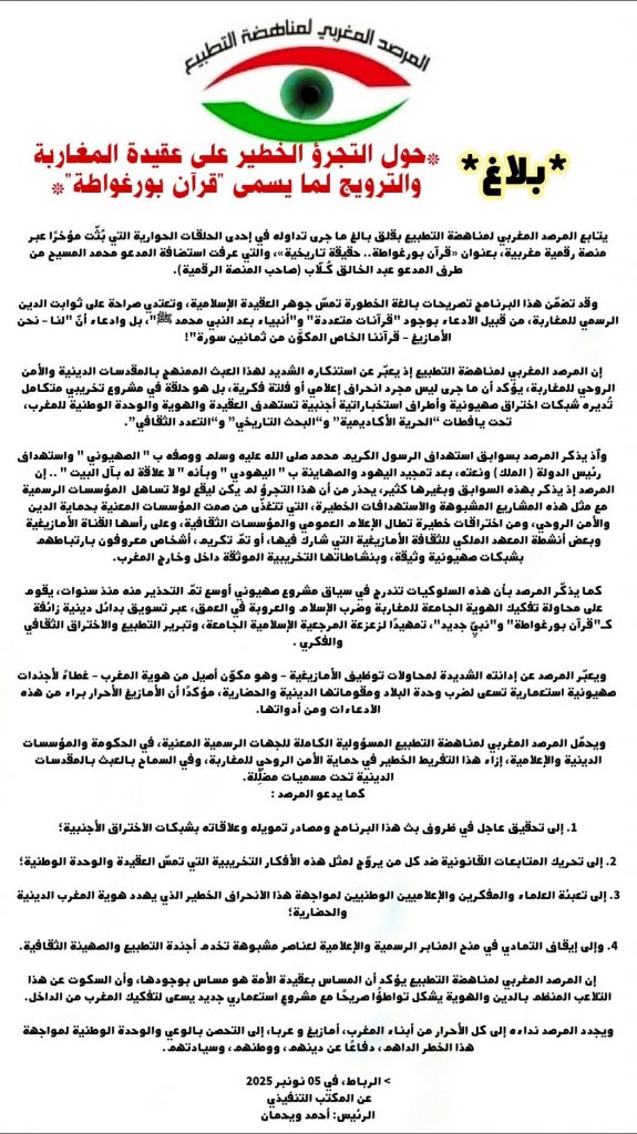 إن المرصد المغربي لمناهضة التطبيع يؤكد أن المساس بعقيدة الأمة هو مساس بوجودها، وأن السكوت عن هذا التلاعب المنظم بالدين والهوية يشكل تواطؤًا صريحًا مع مشروعٍ استعماري جديد يسعى لتفكيك المغرب من الداخل.ويجدد المرصد نداءه إلى كل الأحرار من أبناء المغرب، أمازيغ و عربا، إلى التحصن بالوعي والوحدة الوطنية لمواجهة هذا الخطر الداهم، دفاعًا عن دينهم، ووطنهم، وسيادتهم.>