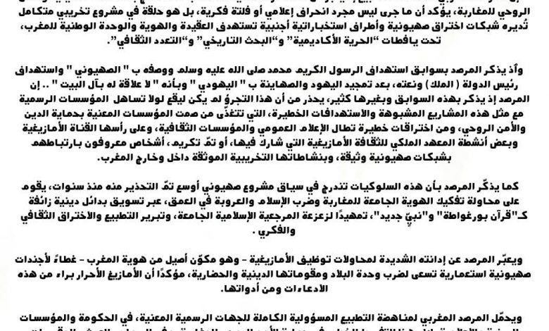 ويعبّر المرصد عن إدانته الشديدة لمحاولات توظيف الأمازيغية – وهو مكوّن أصيل من هوية المغرب – غطاءً لأجندات صهيونية استعمارية تسعى لضرب وحدة البلاد ومقوماتها الدينية والحضارية، مؤكدًا أن الأمازيغ الأحرار براء من هذه الادعاءات ومن أدواتها. ويحمّل المرصد المغربي لمناهضة التطبيع المسؤولية الكاملة للجهات الرسمية المعنية، في الحكومة والمؤسسات الدينية والإعلامية، إزاء هذا التفريط الخطير في حماية الأمن الروحي للمغاربة، وفي السماح بالعبث بالمقدسات الدينية تحت مسميات مضلِّلة.كما يدعو المرصد :