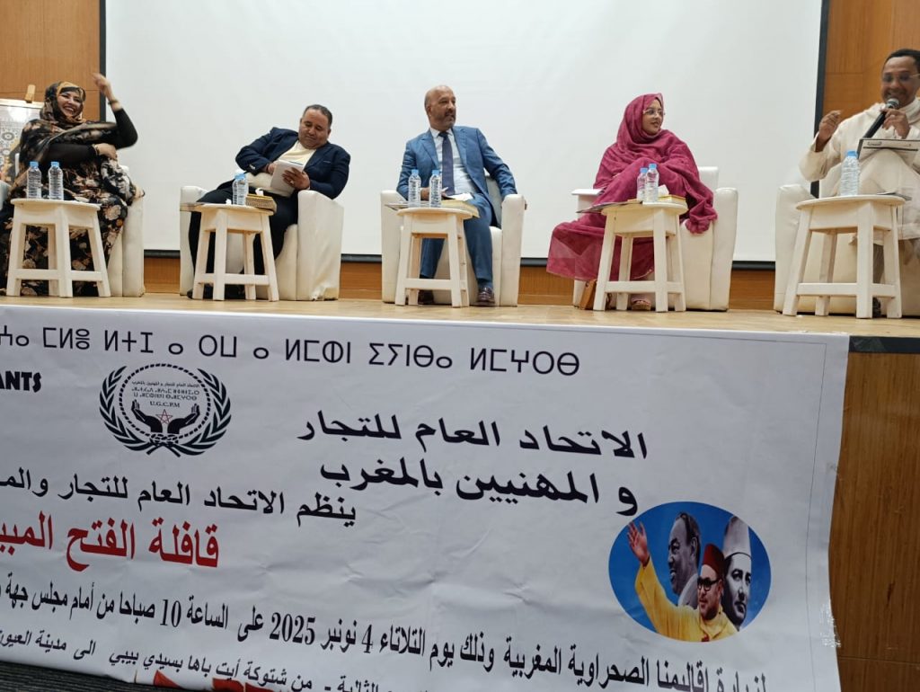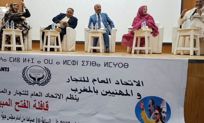 .احتفالًا بالذكرى الخمسينية لعيد المسيرة الخضراء المظفرة، وفي إطار تعزيز التعاون والتواصل بين الجمعيات والاتحادات المهنية، استقبلت السيدة فاطمة كركوب، عضوة المكتب التنفيذي للاتحاد العام للتجار والمهنيين بالمغرب، وعضوة الهيئة الوطنية للمجلس الوطني، ورئيسة الفرع الإقليمي للاتحاد بمدينة العيون، وكذا رئيسة جمعية الطموح للنساء المقاولات بالمغرب، وفدًا من الاتحاد العام للتجار والمهنيين من جميع مدن المغرب يتكون من حوالي 100 شخص، يترأسهم رئيس الاتحاد السيد محمد زيان وأعضاء المكتب، الذين انتقلوا إلى مدينة العيون في إطار “قافلة الفتح المبين” المنظمة من طرف الاتحاد المذكور، احتفالا بالذكرى الخمسينية للمسيرة الخضراء المظفرة. إلى ذلك التأم الجميع بمدخل مدينة العيون مساء يوم الأربعاء 04 نونبر الجاري على الساعة التاسعة ليلاً،حيث قامت القافلة بجولة عبر مختلف أحياء المدينة مع التقاط صور تذكارية بساحة المشور الذي امتلئ بساكنة العيون ومئات المواطنات والمواطنين، القادمين من مختلف جهات وأقاليم المملكة.وقد جرى استقبال الوفد، بشكل رسمي، بحفاوة كبيرة من طرف رئيسة جمعية الطموح للنساء المقاولات بالمغرب، السيدة فاطمة كركوب رفقة أعضاء الجمعية، في أجواء يسودها الترحيب والاحترام والتقدير، حيث عُقد لقاء ودي تم خلاله تبادل وجهات النظر حول واقع التجارة والمقاولة النسائية بالمغرب، وكذا سبل تطوير التعاون بين مختلف الفاعلين في ها القطاع المهني.وفي اليوم الموالي، تُوج برنامج الزيارة بتنظيم المناظرة الوطنية الأولى للتجارة والمقاولة بالمغرب،وهو الحدث العلمي المهني الذي خُصِّص لدراسة ومناقشة التحديات وكذا الإكراهات التي يواجهها التجار والمهنيون عبر التراب الوطني. هذه المناظرة الوطنية، التي أشرف على تأطيرها ورئاسة لجنتها المنظمة الدكتور عبدالعالي الطاهري الإدريسي، الأستاذ الجامعي والخبير في السياسات العمومية، شهدت طرح العديد من العروض القيمة، من طرف كل من السيد محمد الإمام ماء العينين، الفاعل الاقتصادي الوطني والقنصل الشرفي لجمهورية الكوت ديفوار بالمملكة المغربية، والسيد محمد زيان، رئيس اتحاد التجار والمهنيين بالمغرب، والسيدة صفية الرگيبي الإدريسي ممثلة المركز الجهوي للاسثمار بجهة العيون الساقية الحمراء.وقد اختُتمت أشغال هذه المناظرة الوطنية الأولى، برفع برقية ولاء إلى السُدة العالية بالله، صاحب الجلالة والمهابة الملك محمد السادس نصره الله وأيده،تلتها قراءة البيان الختامي، الذي تضمَّن جملة من التوصيات والمُخرجات التي تُؤسِّس للقادم من الدورات بإذن الله تعالى، من قبيل تحسين بيئة العمل والاستثمار الأمثل وتنظيم الأسواق وتعزيز دور المرأة في النهوض بالاقتصاد المحلي والوطني.كما قام الوفد، تحت إشراف السيدة فاطمة كركوب، بجولات ميدانية شملت عددًا من المرافق والمعارض التجارية بمدينة العيون، من بينها الأسواق النموذجية وبعض المحلات التجارية،إذ تم الاطلاع على ظروف اشتغال التجار عن قرب، والاستماع إلى ملاحظاتهم واقتراحاتهم بخصوص تطوير النشاطات التجارية وكذا تجويد الخدمات المقدمة للمستهلكين.