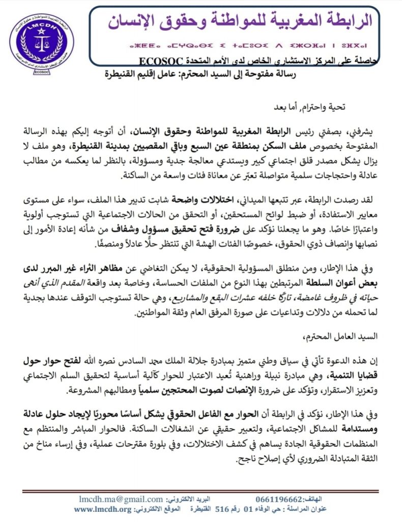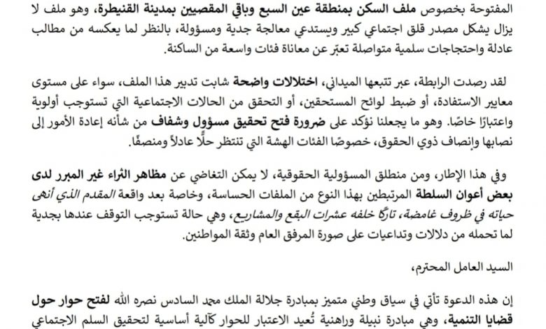 تحية واحترام, أما بعد يشرفني، بصفتي رئيس الرابطة المغربية للمواطنة وحقوق الإنسان، أن أتوجه إليكم بهذه الرسالة المفتوحة بخصوص ملف السكن بمنطقة عين السبع وباقي المقصيين بمدينة القنيطرة، وهو ملف لا يزال يشكل مصدر قلق اجتماعي كبير ويستدعي معالجة جدية ومسؤولة، بالنظر لما يعكسه من مطالب عادلة واحتجاجات سلمية متواصلة تعبّر عن معاناة فئات واسعة من الساكنة. لقد رصدت الرابطة، عبر تتبعها الميداني، اختلالات واضحة شابت تدبير هذا الملف، سواء على مستوى معايير الاستفادة، أو ضبط لوائح المستحقين، أو التحقق من الحالات الاجتماعية التي تستوجب أولوية واعتبارًا خاصًا. وهو ما يجعلنا نؤكد على ضرورة فتح تحقيق مسؤول وشفاف من شأنه إعادة الأمور إلى نصابها وإنصاف ذوي الحقوق، خصوصًا الفئات الهشة التي تنتظر حلًّا عادلاً ومنصفًا. وفي هذا الإطار، ومن منطلق المسؤولية الحقوقية، لا يمكن التغاضي عن مظاهر الثراء غير المبرر لدى بعض أعوان السلطة المرتبطين بهذا النوع من الملفات الحساسة، وخاصة بعد واقعة المقدم الذي أنهى حياته في ظروف غامضة، تاركًا خلفه عشرات البقع والمشاريع، وهي حالة تستوجب التوقف عندها بجدية لما تحمله من دلالات وتداعيات على صورة المرفق العام وثقة المواطنين.السيد العامل المحترم،إن هذه الدعوة تأتي في سياق وطني متميز بمبادرة جلالة الملك محمد السادس نصره الله لفتح حوار حول قضايا التنمية، وهي مبادرة نبيلة وراهنية تُعيد الاعتبار للحوار كآلية أساسية لتحقيق السلم الاجتماعي وتعزيز الاستقرار، وتؤكد على ضرورة الإنصات لصوت المحتجين سلمياً ومطالبهم المشروعة.وفي هذا الإطار، نؤكد في الرابطة أن الحوار مع الفاعل الحقوقي يشكل أساسًا محوريًا لإيجاد حلول عادلة ومستدامة للمشاكل الاجتماعية، ولتعبير حقيقي عن انشغالات الساكنة. فالحوار المباشر والمنتظم مع المنظمات الحقوقية الجادة يساهم في كشف الاختلالات، وفي بلورة مقترحات عملية، وفي إرساء مناخ من الثقة المتبادلة الضروري لأي إصلاح ناجح.كما نسجل بإيجابية التحولات الملحوظة في تعاطيكم مع عدد من الملفات خلال الفترة الأخيرة، وما عرفته المدينة من أوراش تنموية مهمة، مما يعزز قناعتنا بأن القنيطرة تتجه نحو مستقبل أفضل. غير أن هذه الدينامية تبقى رهينة بمعالجة جذرية لملف السكن، وفتح قنوات تواصل مؤسساتي منتظم مع الفاعلين الحقوقيين والمجتمع المدني.إن تجاوز الأزمات الاجتماعية، وعلى رأسها أزمة السكن، يمر حتمًا عبر حوار جاد ومسؤول يضع مصلحة المواطن في صلب القرار الإداري، ويستمع للنقد البناء الصادر عن حس وطني صادق يلتزم بالدفاع عن استقرار الوطن ورقيه ووحدته.السيد العامل المحترم،إن الرابطة المغربية للمواطنة وحقوق الإنسان تعبر عن استعدادها الكامل للانخراط المسؤول في أي مسعى يروم معالجة هذا الملف بما يحفظ الحقوق، ويعزز الثقة، وينسجم مع التوجيهات الملكية السامية، ويواكب تطلعات ساكنة القنيطرة إلى العدالة الاجتماعية والتنمية الشاملة.