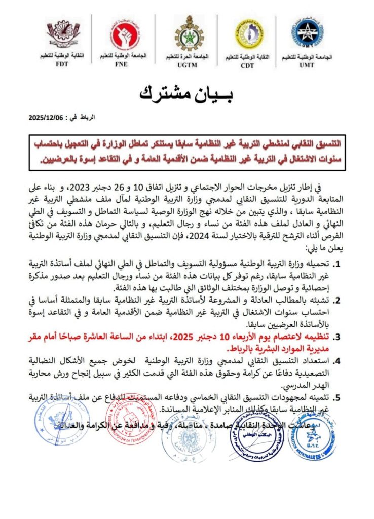 كما دعا التنسيق النقابي إلى تنظيم اعتصام وطني يوم الأربعاء 10 دجنبر 2025 ابتداءً من الساعة العاشرة صباحًا أمام مديرية الموارد البشرية بوزارة التربية الوطنية بالرباط.