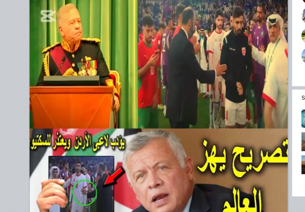 وجدت نفسي كمواطن مغربي حر وغيور على كرامة أية إنسان عربي كيفما كانت جنسيته ،أن أعبر بكل احترام وتقدير وافتخار بشخصية ملك الأردن والذي انتقد بشدة لاعبي الفريق الوطني الأردني الذين رفضوا مد أيديهم للسلام على المدرب الوطني المغربي الخلوق ،هذا السلوك النشاز الناتج عن عدم تقبل الهزيمة وخسارة الكأس ،لا يمت بصلة لأخلاق الشعب الأردني الصديق الذي له مكانة خاصة في قلوب كل المغاربة،جلالة الملك الأردني الشهم كلف ولي العهد للسفر إلى المغرب رفقة الفريق الوطني الأردني للذهاب جماعة لزيارة المدرب الوطني المغربي الخلوق وتقديم الإعتذار على ما بدر منهم من سلوك لا يليق بتقاليد وعادات وأخلاق الشعب الأردني الصديق الذي له مكانة في قلوب كل المغاربة .