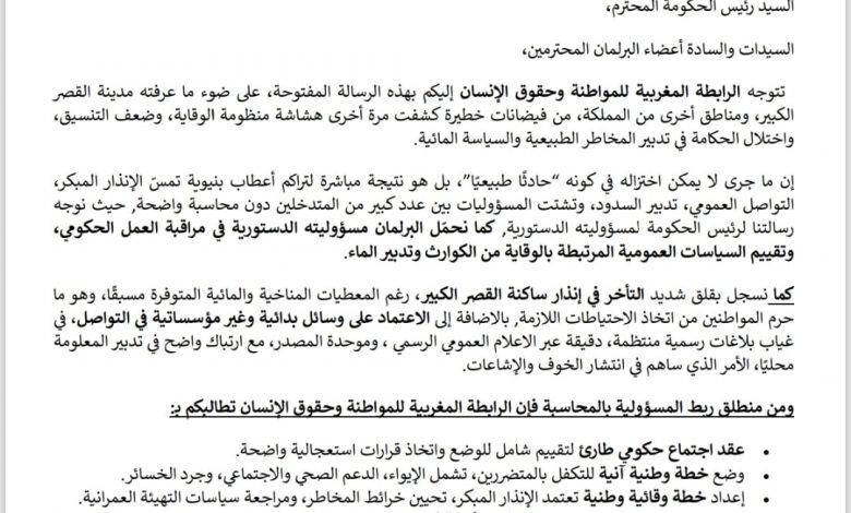 السيد رئيس الحكومة المحترم،السيدات والسادة أعضاء البرلمان المحترمين، تتوجه الرابطة المغربية للمواطنة وحقوق الإنسان إليكم بهذه الرسالة المفتوحة، على ضوء ما عرفته مدينة القصر الكبير، ومناطق أخرى من المملكة، من فيضانات خطيرة كشفت مرة أخرى هشاشة منظومة الوقاية، وضعف التنسيق، واختلال الحكامة في تدبير المخاطر الطبيعية والسياسة المائية.إن ما جرى لا يمكن اختزاله في كونه “حادثًا طبيعيًا”، بل هو نتيجة مباشرة لتراكم أعطاب بنيوية تمسّ الإنذار المبكر، التواصل العمومي، تدبير السدود، وتشتت المسؤوليات بين عدد كبير من المتدخلين دون محاسبة واضحة, حيث نوجه رسالتنا لرئيس الحكومة لمسؤوليته الدستورية, كما نحمّل البرلمان مسؤوليته الدستورية في مراقبة العمل الحكومي، وتقييم السياسات العمومية المرتبطة بالوقاية من الكوارث وتدبير الماء.كما نسجل بقلق شديد التأخر في إنذار ساكنة القصر الكبير، رغم المعطيات المناخية والمائية المتوفرة مسبقًا، وهو ما حرم المواطنين من اتخاذ الاحتياطات اللازمة, بالاضافة إلى الاعتماد على وسائل بدائية وغير مؤسساتية في التواصل، في غياب بلاغات رسمية منتظمة، دقيقة عبر الاعلام العمومي الرسمي ، وموحدة المصدر، مع ارتباك واضح في تدبير المعلومة محليًا، الأمر الذي ساهم في انتشار الخوف والإشاعات.ومن منطلق ربط المسؤولية بالمحاسبة فإن الرابطة المغربية للمواطنة وحقوق الإنسان تطالبكم بـ:• عقد اجتماع حكومي طارئ لتقييم شامل للوضع واتخاذ قرارات استعجالية واضحة.• وضع خطة وطنية آنية للتكفل بالمتضررين، تشمل الإيواء، الدعم الصحي والاجتماعي، وجرد الخسائر.• إعداد خطة وقائية وطنية تعتمد الإنذار المبكر، تحيين خرائط المخاطر، ومراجعة سياسات التهيئة العمرانية.• اعتبار بعض المناطق المتضررة مناطق منكوبة كلما توفرت الشروط القانونية، بما يتيح تعبئة موارد استثنائية وتعويض المتضررين.من جهة أخرى لقد أبرزت الفيضانات بوضوح خطورة تعدد المتدخلين وتداخل الاختصاصات في مجال الماء (السدود، الماء الصالح للشرب، مياه السقي، الحماية من الفيضانات).وعليه، نطالب بـ:• تجميع السياسة المائية الوطنية في متدخل عمومي مؤسساتي واحد بصلاحيات واضحة ومسؤولية كاملة.• اعتماد حكامة مائية تقوم على الشفافية، النجاعة، وربط المسؤولية بالمحاسبة.ومن اجل التأكيد على جدية التعاطي مع الإختلالات في تدبير الكوارث الطبيعية تطالب الرابطة بـ:• فتح تحقيق وطني مستقل حول عدم تنظيف عدد من السدود من الأوحال، التي تشكل نسبة مهمة من حقيناتها وتقلص قدرتها التخزينية.• الكشف عن مآل الميزانيات العمومية المرصودة لتنظيف السدود: أين صُرفت؟ ماذا أُنجز؟ ومن يتحمل المسؤولية؟• نشر تقرير وطني مفصل حول وضعية السدود، حجم الترسبات، والكلفة البيئية والاقتصادية لذلك.• إخضاع برامج صيانة السدود لمراقبة مؤسسات الحكامة والرقابة.ما يمكن ان نختم به رسالتنا هو التأكيد على أن الحق في الحياة، والحق في الماء، والحق في الحماية من المخاطر حقوق دستورية وإنسانية لا تقبل التأجيل ولا التدبير الظرفي, وإن ما وقع بمدينة أسفي وما يمكن أن يقع بالقصر الكبير يجب أن يكون منطلقًا لإصلاح عميق وشجاع، لا مناسبة عابرة سرعان ما تُطوى.