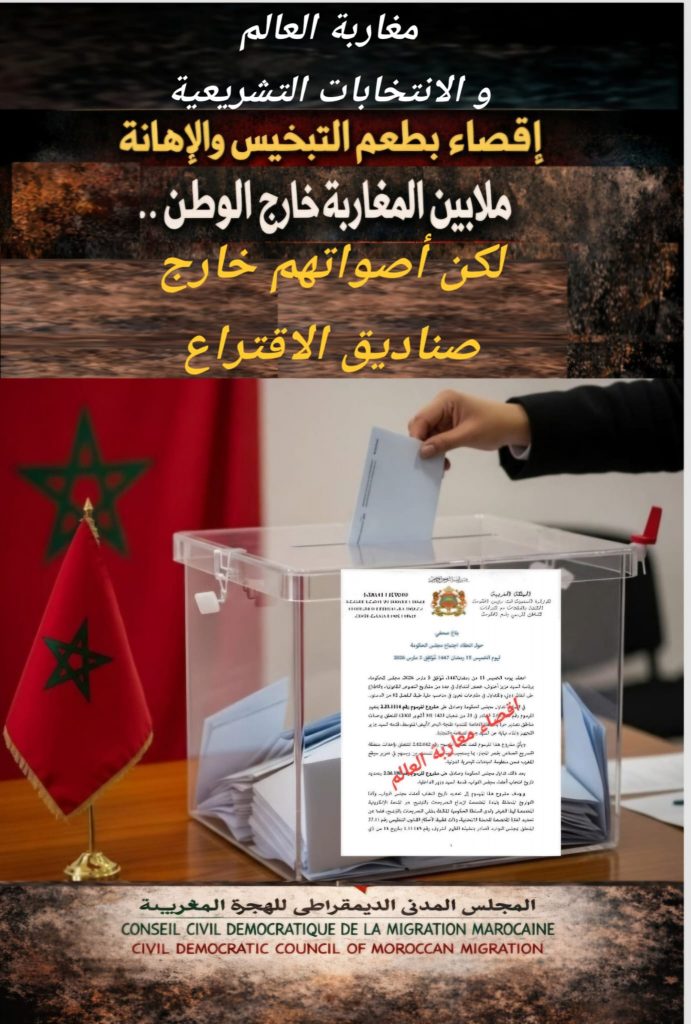 على إثر مصادقة المجلس الحكومي على مرسوم يحدد يوم 23 شتنبر 2026 موعداً للانتخاب التشريعية، وعلى أساس القانون التنظيمي رقم 53.25 المتعلق بمجلس النواب ، نسجل بقلق بالغ أن هذا الإطار القانوني يكرس مرة أخرى إقصاء المغاربة المقيمين بالخارج من حقهم المشروع في المشاركة السياسية الكاملة، وهو ما يشكل تعارضاً واضحاً مع مقتضيات دستور المملكة المغربية الذي ينص صراحة على المساواة بين جميع المغاربة في الحقوق والواجباتإن هذا القرار يعكس توجهاً مقلقاً يرمي إلى تكريس التهميش السياسي لملايين المواطنات والمواطنين من مغاربة العالم، في تنكر للحقوق الدستورية و تجاهل تام للتوجيهات الملكية المتكررة ، والتي دعت بوضوح إلى تمكين مغاربة العالم من حقوق المواطنة الكاملة، وفي مقدمتها الحق في المشاركة السياسية والتمثيلية البرلمانيةإن إقصاء ما يفوق 15% من الشعب المغربي من التمثيلية داخل المؤسسة التشريعية يعد مساساً خطيراً بالمسار الديمقراطي وبمبدأ المشاركة السياسية المتكافئة، ويشكل تراجعاً عن المكتسبات التي تحققت في مسار بناء دولة الحق والقانون، وفي الجهود التي بذلها المغرب لطي صفحة الماضي المرتبطة بما عرف بـ سنوات الرصاصأكيد أن استمرار هذا الاقصاء تترتب عنه عواقب سياسية و اقتصادية و اجتماعية، و نذكر منها الخصوص شعور مغاربة العالم بحقوق ناقصة و تقليص الثقة في المؤسسات، استغناء المغرب عن كفاءات و خبرات في الإدارة و الحكامة و الديمقراطية، تراجع الإحساس بالانتماء الوطني خصوصا لدى الاجيال الجديدة و تأثير سلبي على التنمية الاقتصادية و المحلية في هذا الاطار، يؤكد المجلس المدني الديمقراطي بالمناسبة أن مغاربة العالم كانوا ولا يزالون فاعلين أساسيين في التحولات الاقتصادية والاجتماعية والثقافية و السياسية التي يعرفها المغرب، كما كانوا في طليعة المدافعين عن القضايا الوطنية الكبرى، وفي مقدمتها الدفاع عن الوحدة الترابية وتعزيز حضور المغرب على دولياً.و يعبر المجلس المدني الديمقراطي للهجرة المغربية في هذا السياق عن استنكاره الشديد للتصريحات الأخيرة الصادرة عن وزير الصناعة و التجارة، والتي نعتبرها تصريحات غير مسؤولة تمس بكرامة مغاربة العالم وتتناقض مع القيم الأخلاقية والتقاليد المغربية القائمة على الاحترام والتقدير المتبادل.وعليه، فإن المجلس المدني الديمقراطي للهجرة المغربية يوجه الدعوة مجددا إلى:
