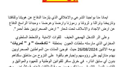 بيان تضامني ايمانا منا بواجبنا الشرعي والاخلاقي الذي يلزمنا الدفاع عن هويتنا وثقافتناوتاريخنا وتراثنا و ثروتنا و رموزنا وارضنا وعرضنا…