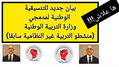 بلاغ عاجل من تنسيقية مدمجي وزارة التربية الوطنية…الوزارة تتحمل مسؤولية عدم الوفاء بالإلتزامات!!